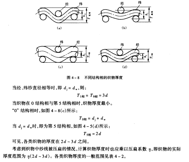 织物的厚度是指正反两个支持表面之间的距离,如图4—8各分图中的T所示,织物的厚度是随纱线细度与结构相的变化而变化的。