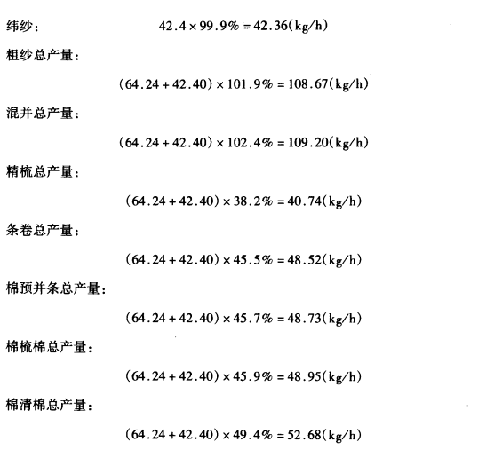 已求得织物的经、纬纱总用纱量分别为64.24kg/h和42.4kg/h,即经纱的细纱总产量为64.24kg/h,纬纱的细纱总产量为42.40kg/h。按上述公式可计算出各工序的总产量。