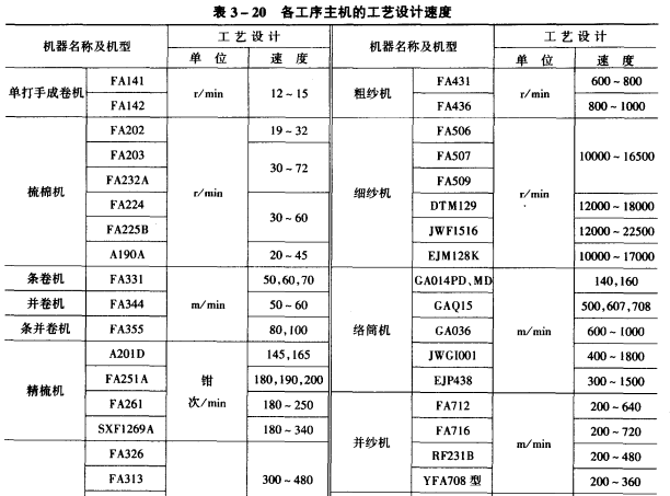 (2)梳棉机:梳棉机道夫的速度应根据设备型号、生条定量、产量和质量的要求而定。速度提高,产量增加,但不利于分梳除杂,设备配备数量减少,且影响梳棉条质量和后纺生产潜力的发挥。一股纺中特纱时,道夫速度可较高,纺细特纱和化学纤维纱时,道夫速度宜低些。