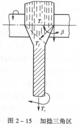 1.内外转移 当须条从细纱机前罗拉握持处吐出,便受到纺纱张力及加捻作用,使原来与须条平行的纤维倾斜,纱条由粗变细。把罗拉吐出处到成纱的过渡区域称为加捻三角区,如图2—15所示。图中Ty为纺纱张力,β为纤维与纱轴的夹角,Tf为纤维由于纺纱张力而受到的力,Tt为Tf沿着纱芯方向的分力,称为向心力。从图2—15中可以得出:
