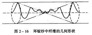 从上述可分析出,随着纤维在纱中所处半径的增大,向心力Tt也增大,即处在外层的纤维的张力和向心力较大,容易向纱芯挤入(向内转移),而处在内层的纤维张力和向心力较小,易被外层纤维挤到外面(向外转移),形成新的内外层关系,这种现象称之为内外转移。一根纤维在加捻三角区中可以发牛多次这样的内外转移,从而形成了复杂的圆锥形螺旋线结构,如图2—16所示。