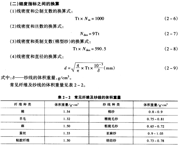 纱线的细度间接指标有线密度(Tt)、旦数(Ndem)、公制支数(Nm)和英制支数(Ne)。其中线密度、旦数和公制支数的概念及计算与纤维相同,请参考章,本部分仅举例说明。