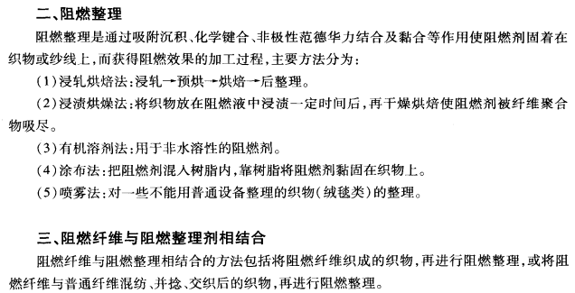根据燃烧的三要素和燃烧过程的特点,要达到阻燃的目的,就必须控制住固相分解减少可燃气体的产生成抑制气相燃烧,削弱可燃气体的热能,这是一切阻燃技术的宗旨。具体的阻燃方祛可以分为制造阻燃纤维,对织物进行阻燃整理和阻燃纤维与阻燃整理相结合三种方法。