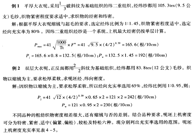 另外,经二重、纬二重与双层织物,也可根据产品的特征和织造要求,利用充实率,选定织物组织、毛纱持数,计算单层时的密度,再乘以经纬密度比即可计算呢坏上机密度。: