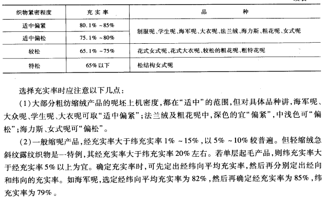 粗纺产品充实率指的是呢坯的上机密度与大上机密度的比值。用来反映纱线在呢坯中的充满程度,并可比较不同组织的织物织造难易程度和紧密程度。上述紧度只能表示相同组织织物的紧密程度,而不能将不同组织的织物进行比较,因为不同的组织具有不同的大密度。在织物设计时,一般根据品种要求选样充实率,再根据计算出的大密度求出上机密度。