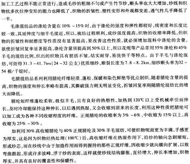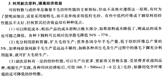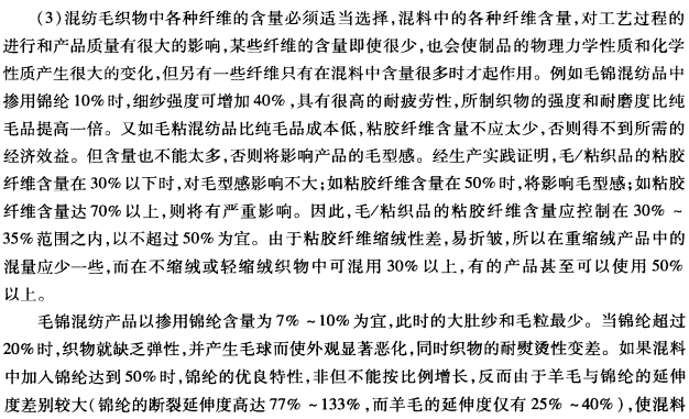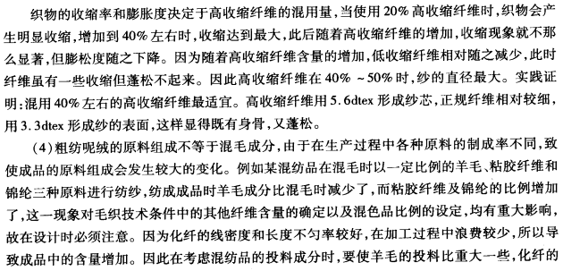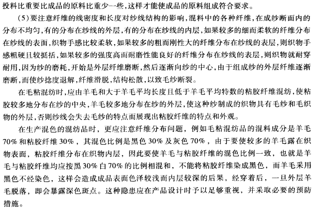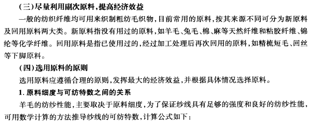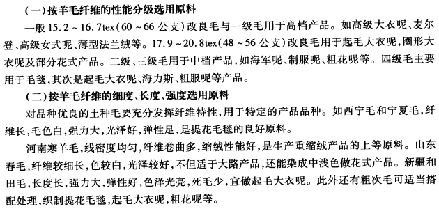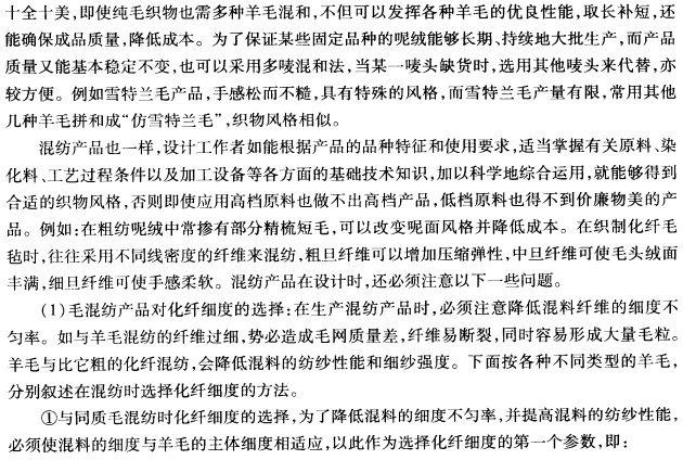 由于粗纺产品品种多,风格不一,可选原料广泛。因此在产品设计时,首先要根据产品的特点、风格、市场价格来考虑,合理选用原料。粗纺织物因纺纱工艺与精纺纱不同,选择原料重点要从下面两方面来考虑:一方面按照织物风格特征、服用性能等确定原料的品种线密度与种类,另一方而要按照织物的经济价值来确定下脚料混用的种类与比例,选用什么原料为经济合理,或对现有原料如何使用使之成为优良的产品,都是生产粗纺产;品所必须考虑的问题。