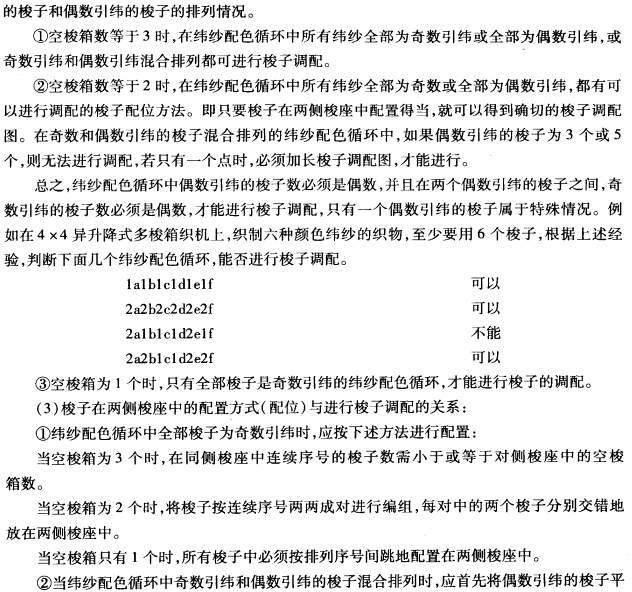 所谓能进行调配,即在整个调配过程中,每种纬纱的梭子都有适当的梭箱被其利用。并且当所有的梭子都已回到各自原来的梭箱时,恰好完成几个(正整数)纬纱配色循环。能进行梭子调配,说明具有这种纬纱配色循环的织物,能在某一特定的织机上织制。相反,不能进行梭子调配,就是不能在织机上进行织造。织物能否在织机上织造,还需满足以下几个条件: