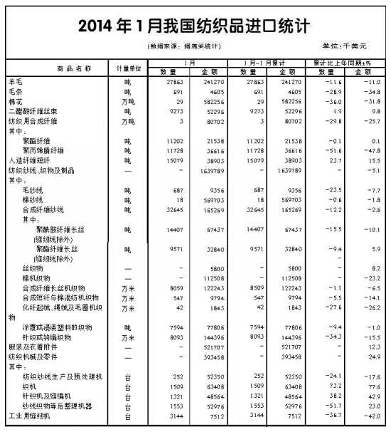 今年1月,全国纺织品进口16.4亿美元,服装进口5.2亿美元,纺织品进口下降4.7%,服装增长13.4%。纺织品进口下降主要是由纱线和面料进口下降所致,降幅分别为2.2%和14.3%。纱线中,棉纱线由于同比基数较大而出现回落,进口量、值分别下降0.6%和1.8%;面料中占主要份额的棉制面料、化纤制面料全部下降。服装中主要进口商品针织、梭织服装进口量增幅达34%,进口平均单价下降13.5%。