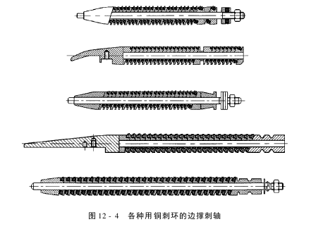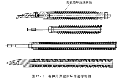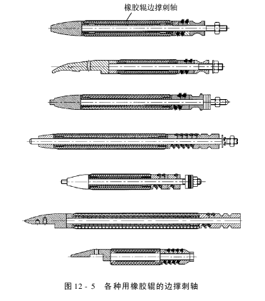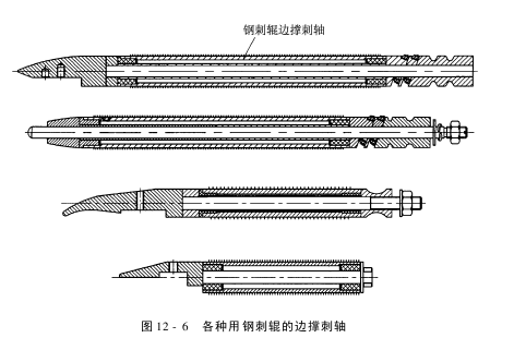 (2)无梭织机边撑装置的结构,主要有铜刺环运转的,聚氨酯环运转的,橡胶辊运转的,钢刺辊运转的4种形式如图12-4~图12-7所示。厚型织物、毛纺型织物、中厚型织物,要配铜刺环运转的边撑装置,但针露出高度和针排列需按织物的厚度和经纬密度变动,轻薄型织物、长丝类织物、低特高密织物要配橡胶辊运转的丝织边撑装置,张力大的低特高密织物、绢纺型织物要配钢刺辊运转的钢制边撑装置。