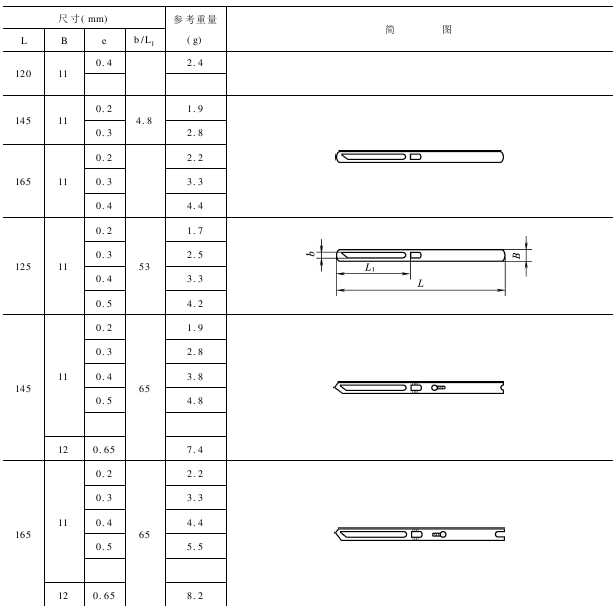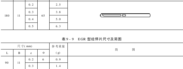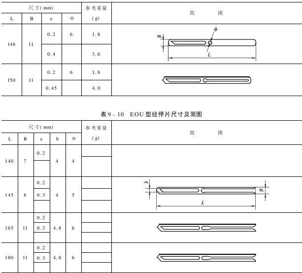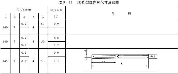 无梭织机大多用电器式经停片,其型号有EGU型、EOU型、EGR型、EOR型尺寸及简图见表9-8~表9-11,其标记代号示意如下:
