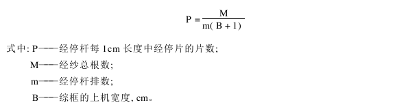 经停片穿在经停杆上的允许密度与经停片的厚度有关,然而经停片的厚度又取决于经纱的特数,每根经停杆上经停片的排列密度用下式计算:
