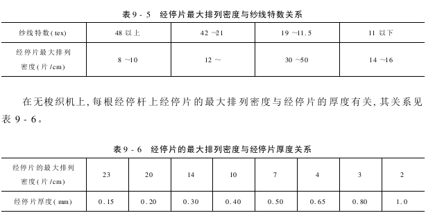 在棉织生产中,每根经停杆上经停片的大排列密度与纱线特数有关,纱线特数小,经停片密度可大些;纱线特数大,密度不能过大。经停片密度与纱线特数的关系见表9-5。