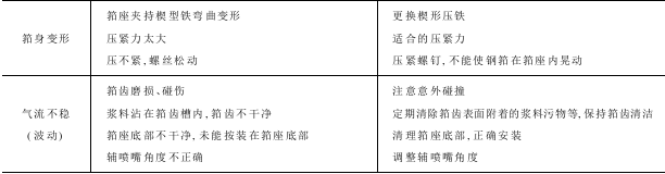 喷气筘筘齿与经纱磨擦造成的磨损属于正常的磨损,但有相当一部分是属于不正常情况产生的损坏、磨损,产生的原因及防止的方法见表8-14。