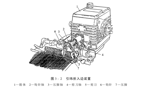 在引入的纬纱由钢筘打纬并被边经纱织住后,压脚7就伸出夹持住纬纱,然后由剪刀5将纬纱在纬纱剪刀和边经纱之间距离第1根经纱约11mm处剪断,在纬纱被夹住并剪断的同时,钩针6也在上下开口之间转动,随着钩针和压脚座的相对运动,纬纱被钩针钩住,纬纱头便随着钩针从压脚座中带入布边。