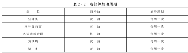 加油点为运动啮合面、各个黄油嘴及链轮,表2-2列出了各加油点加油周期。