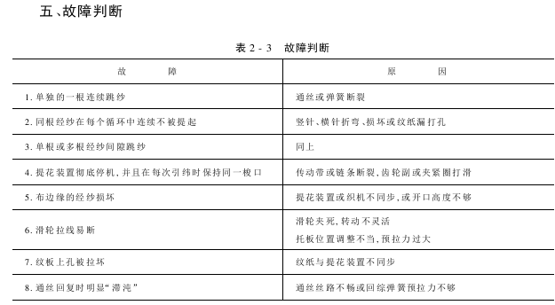 应该定期检查提花装置,以保证机器的各部件处于良好的工作状态。特别需要检查通丝和滑轮、纹纸的工作状态是否正常,通丝在目板中的线段是否有损坏现象,回综件周围不允许有灰尘脏物,用压缩空气定期清扫。