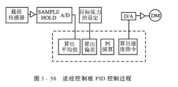 送经控制板的PID控制过程见图3-58。它是由单片机系统通过A/D电路检测过程y,并计算误差e=u-y和控制变量u,通过D/A变换后输出到执行机构(伺服电动机),使过程变量y稳定在设定值上。这种控制是根据采样时刻的误差值计算控制变量u的,是一种采样控制。