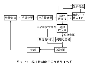 一般由织机后梁、张力检测器及计算机组成。当后梁摆动使张力杆位移,从而使张力传感器受到压力。张力传感器将张力杆的变形力转变成为与经纱张力相应变化的电信号,并将其信号输入至计算机。计算机将采集到的若干信号处理后计算出张力平均值,并将此值与张力预定值进行比较,作为下个周期的送经依据,从而决定织轴的转动量。