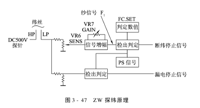 (1)触指式探纬原理:织机运转时,水流及含水的纬丝与探针接触,由于水的导电性,使一定的电流由高压侧探针流向低压侧探针,从而使探纬器信号处理单元接收到所需的纬丝信号。这里接收到的信号包括:纬丝信号、水信号、纬尾信号及漏电信号。探纬信号处理单元就是将此混合信号加以处理,滤去无用信号,保留并放大纬丝信号。信号处理单元利用PS信号进行时段控制,将放大整形后的探纬信号进行计数比较,然后输出工作指令。探纬接收到的波形如图3-45所示。