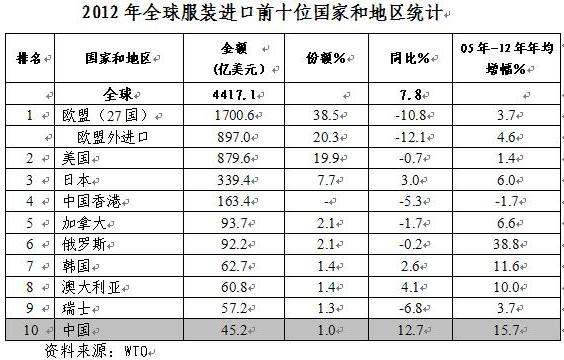 据WTO公布新数据显示,尽管2012年全球经济增长乏力,但全球服装贸易额创新高,出口达到4222.5亿美元,增长2.4%,进口4417.1亿美元,增长7.8%。