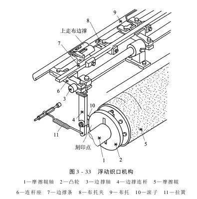 当凸轮2随着摩擦辊5一起转动时,与其贴靠的滚子10和边撑连杆4被迫绕边撑轴3中心作摆动,同时带动布托9作上下摆动,从而使贴靠在布托9顶面的织口也作上下摆动(因布面被拉紧有张力,始终贴靠在布托9上),实现浮动。 AAA面料网DFGRTJUYKYU