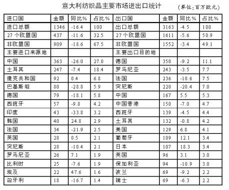 中国2011年前10个月从意大利进口总值增加27.2%,2012年前10个月同比增长5.5%,进口金额为1.67亿欧元。中国自意大利的进口金额占意大利出口总额的5.3%,中国大陆及香港特区从意大利的进口总额仅次于德国。除中国外,意大利纺织面料主要出口市场——美国同比增长了6.8%,日本增长了18.3%。