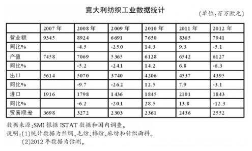 意大利内需市场方面,在两年的持续发展后,出现了大幅度下降,给产业的各个方面都带来消极影响。据估计,2012年,意大利纺织工业(包括棉纺、毛纺、麻纺、丝绸和针织行业在内)的年营业额总额接近80亿欧元,比上年下降5.1%。尽管总额有所下降,但据估算仍将实现26亿欧元的贸易顺差。